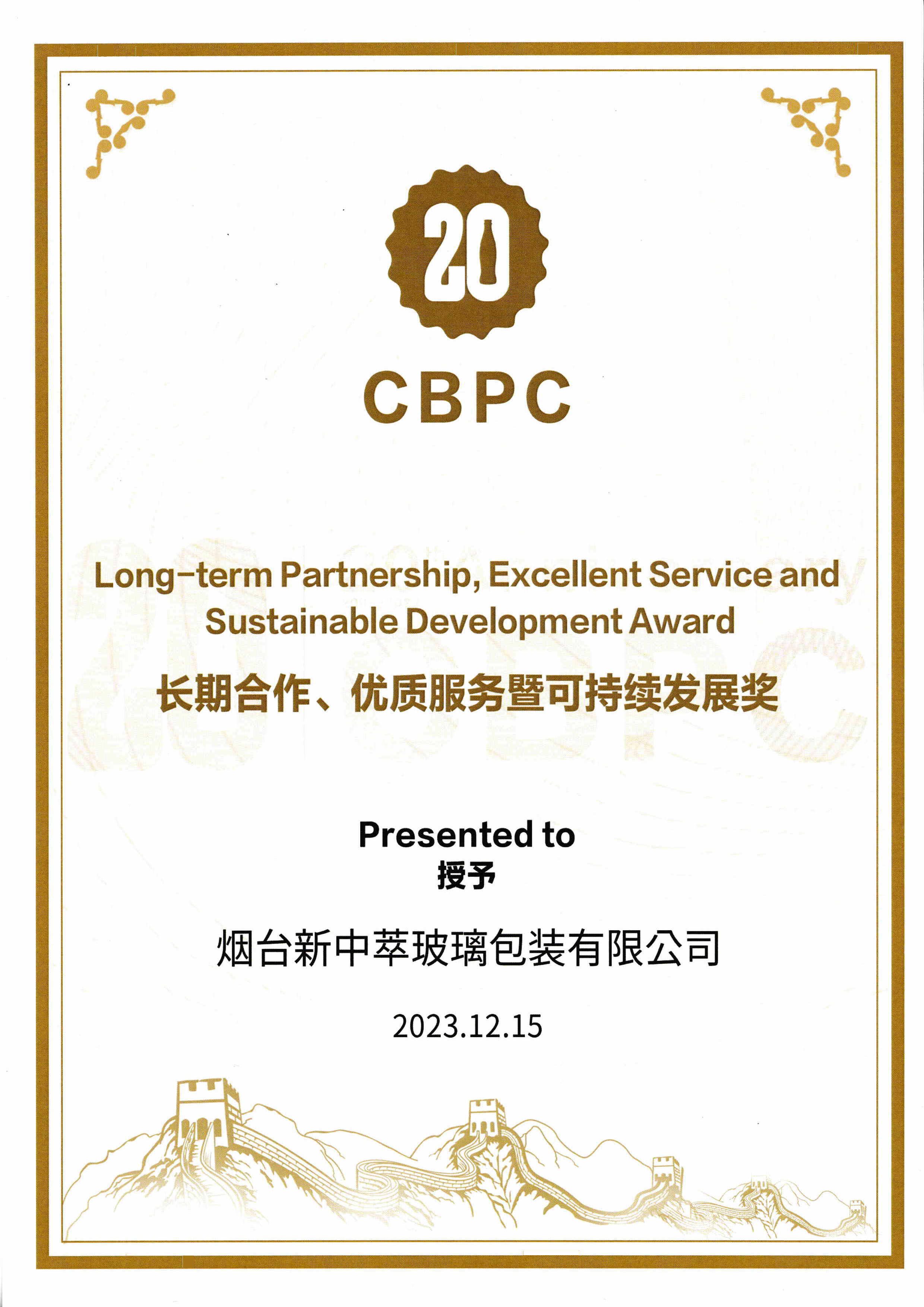 我司喜獲可口可樂CBPC20周年可持續(xù)發(fā)展獎